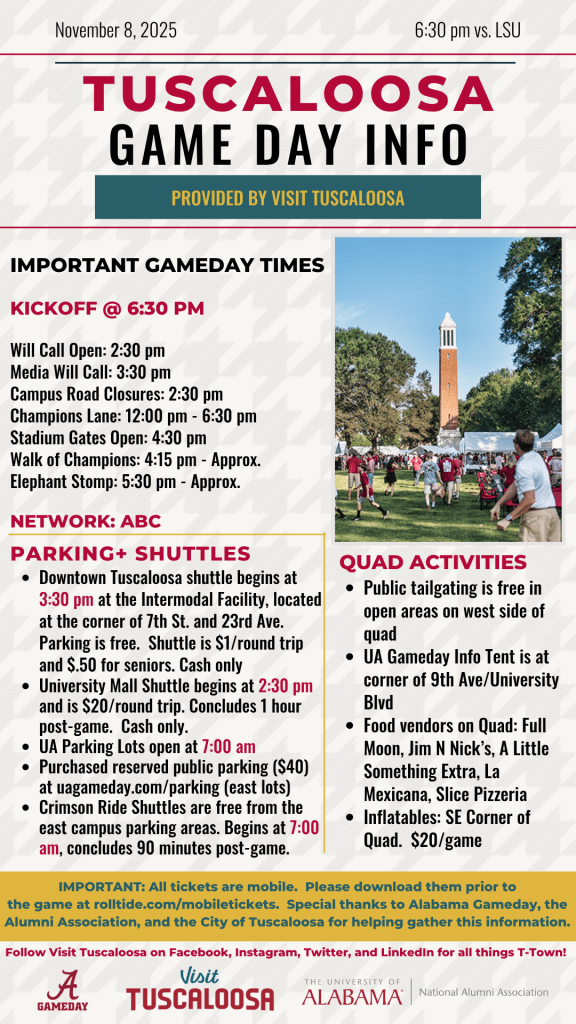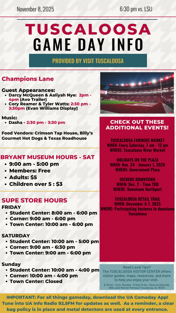 If you’re traveling to Tuscaloosa for the game against LSU on Saturday, November 8, check out the details in the images below for Alabama Gameday info. For more information, you may also visit uagameday.com.