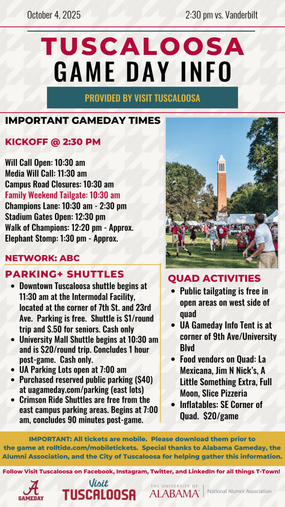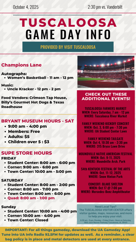 If you’re traveling to Tuscaloosa for the game against Vanderbilt on Saturday, October 4, check out the details in the images below for Alabama Gameday info. For more information, you may also visit uagameday.com.