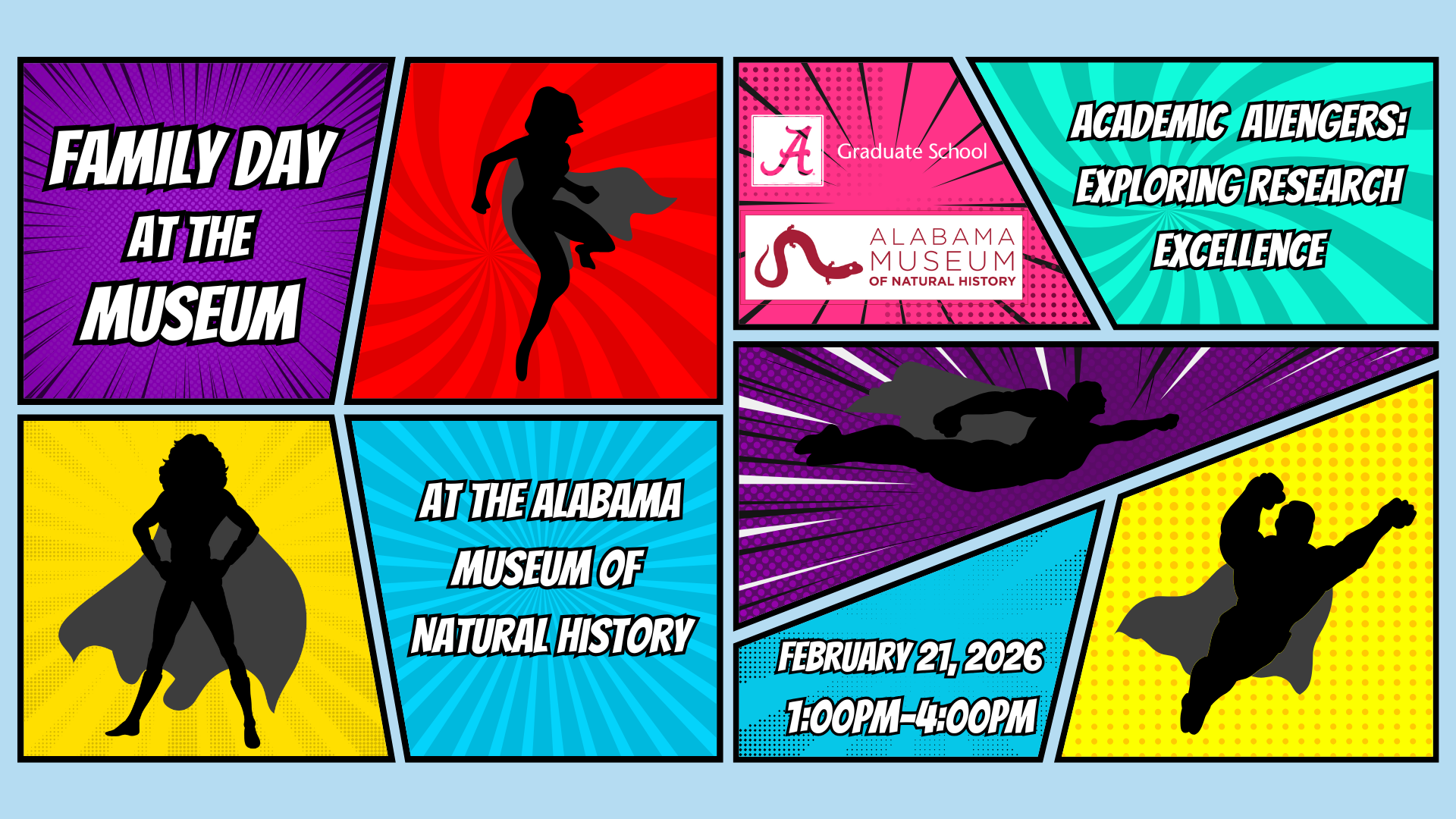 The Alabama Museum of Natural History and The University of Alabama Graduate School invite visitors to a free and family-friendly event participants hands-on exploration of subjects being studied by UA’s Graduate Students. This year’s superhero and comic book-themed “Family Day at the Museum” will be held at the Alabama Museum of Natural History on Saturday, February 21, 2026 from 1:00 p.m. until 4:00 p.m.