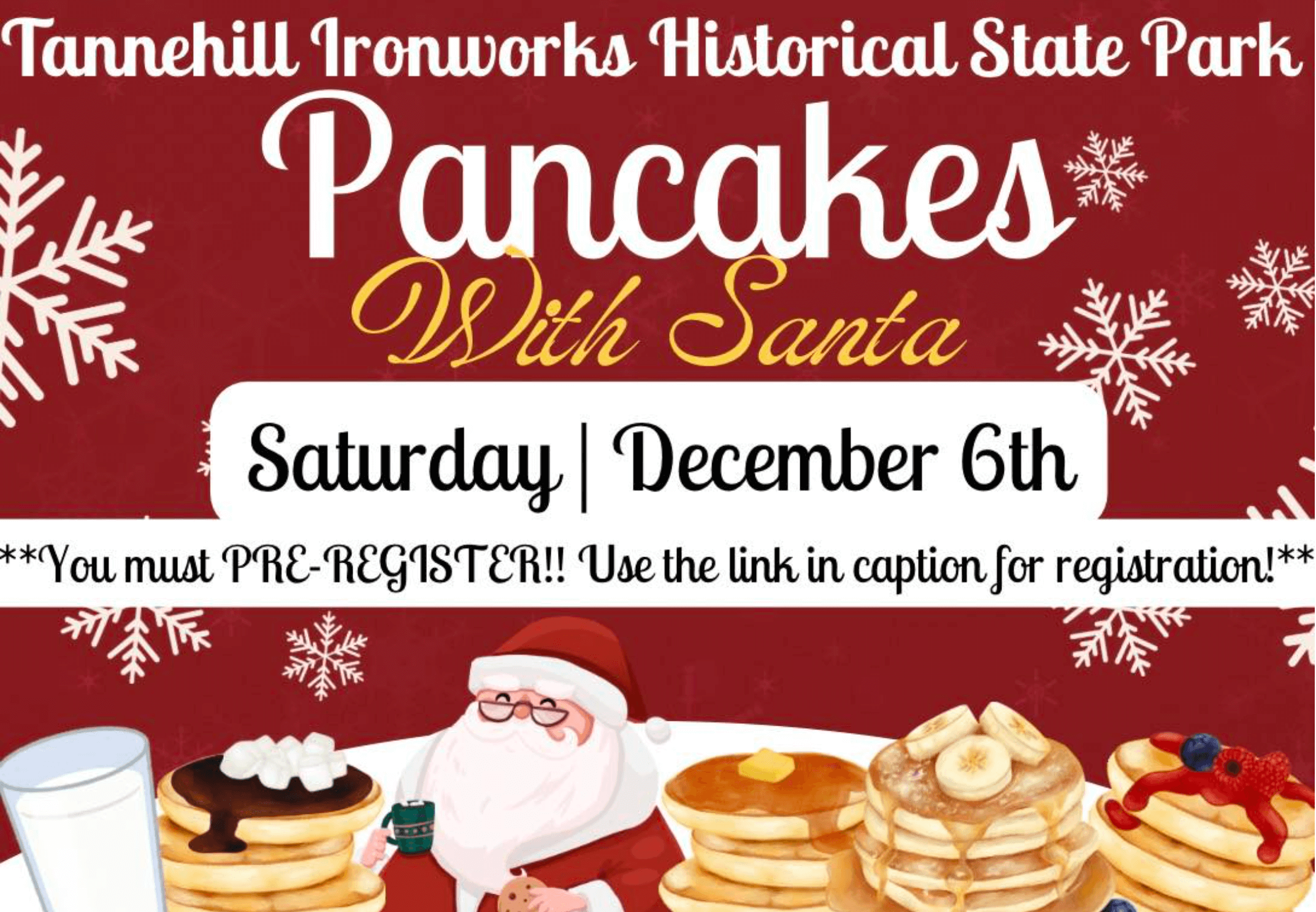 Y’all have been asking – and here it is! Pancakes with Santa will be December 6, 2025 at Tannehill Ironworks State Park! We invite you to bring your cameras for a photo with Santa and enjoy home cooked pancakes!