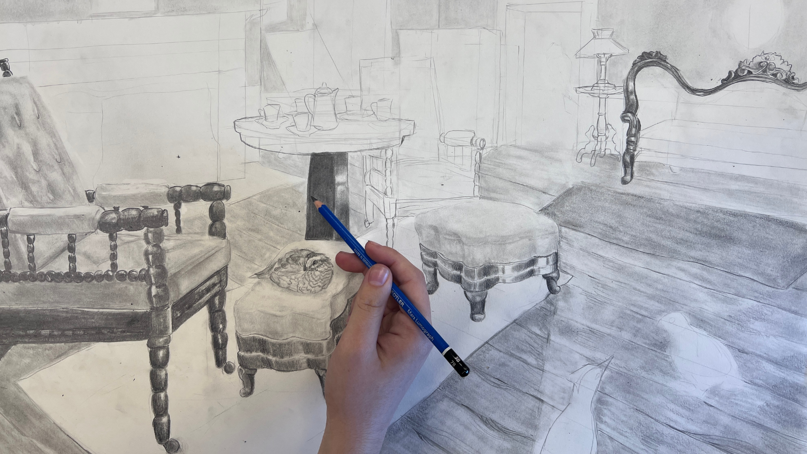 From November 4-8, 2025, works created by University of Alabama students enrolled in ART 110-005 will explore the architectural features of the Gorgas House Museum, depicting either an interior or exterior space through one- or two-point perspective. Instructed by Debanjaly Sen, the students incorporated an imaginative element of their choice and reinterpreted the traditional perspective to create a unique and expressive representation of the historic site.