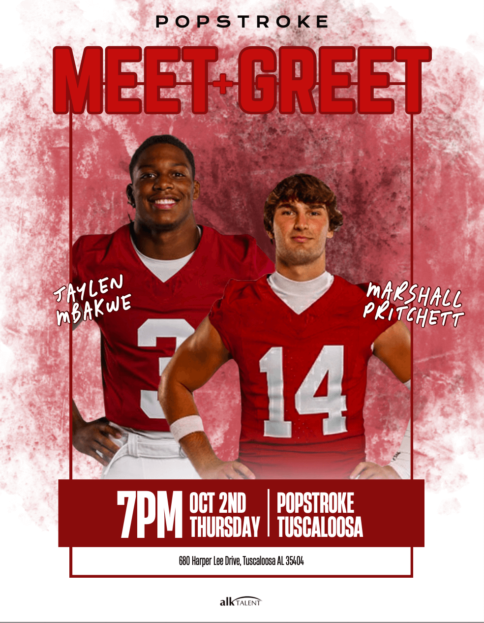 Join us at PopStroke Tuscaloosa on Thursday, October 2nd at 7 PM for an exciting Meet & Greet with Alabama football players Jaylen Mbakwe and Marshall Pritchett!