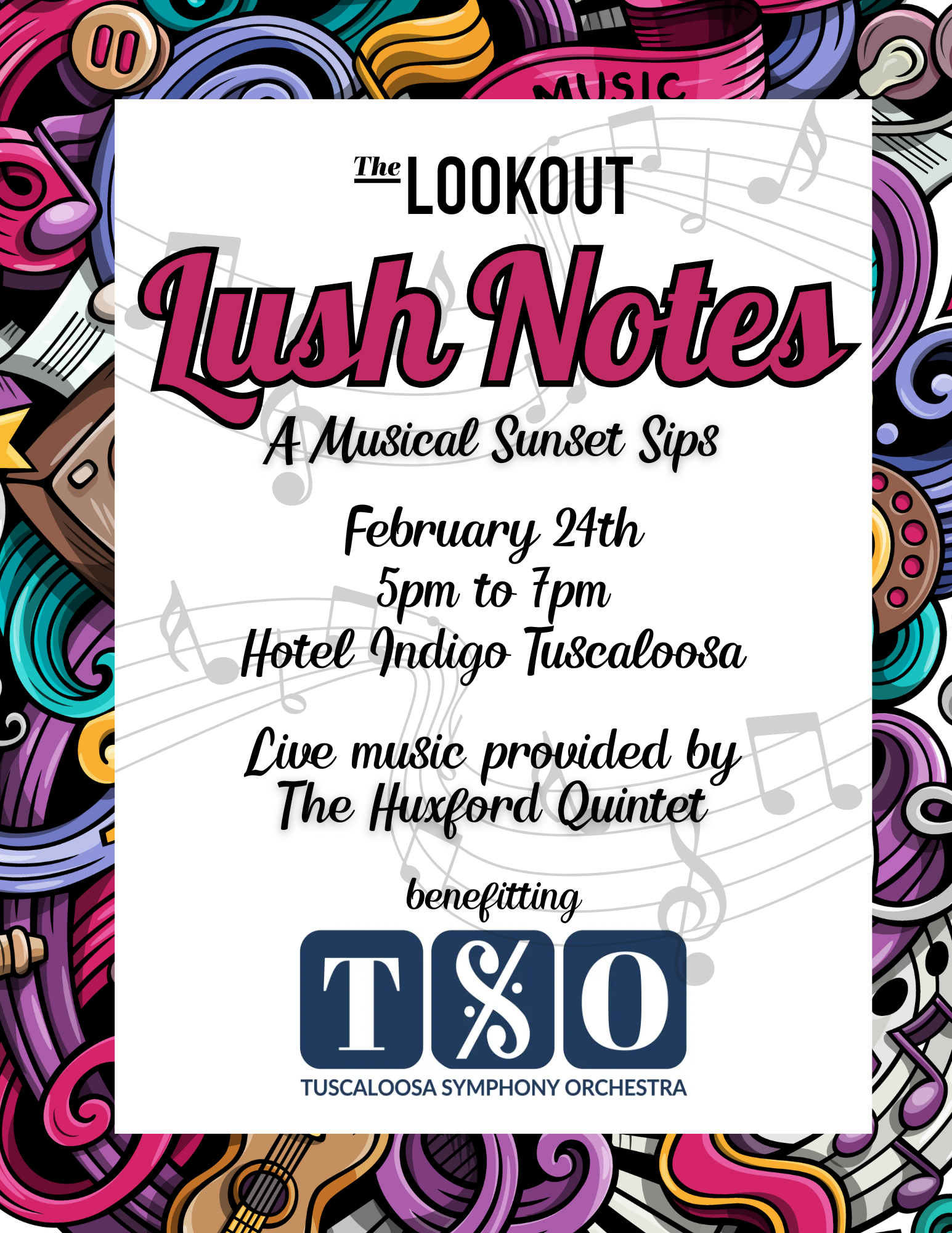 You’re invited to a special event we are hosting on Tuesday, February 24th from 5pm to 7pm: Sunset Sips Lush Notes! We will have special pricing on music-themed wines. The event will be held at our iconic Lookout Rooftop Bar on the top floor of Hotel Indigo Tuscaloosa. We will have the Huxford Quintet playing live music, and the firepits and heaters will be lit on our terrace to keep everyone warm in this cooler weather. Our restaurant will be serving our menu and cocktails. Come for discounts on great wine and stay for giveaways!