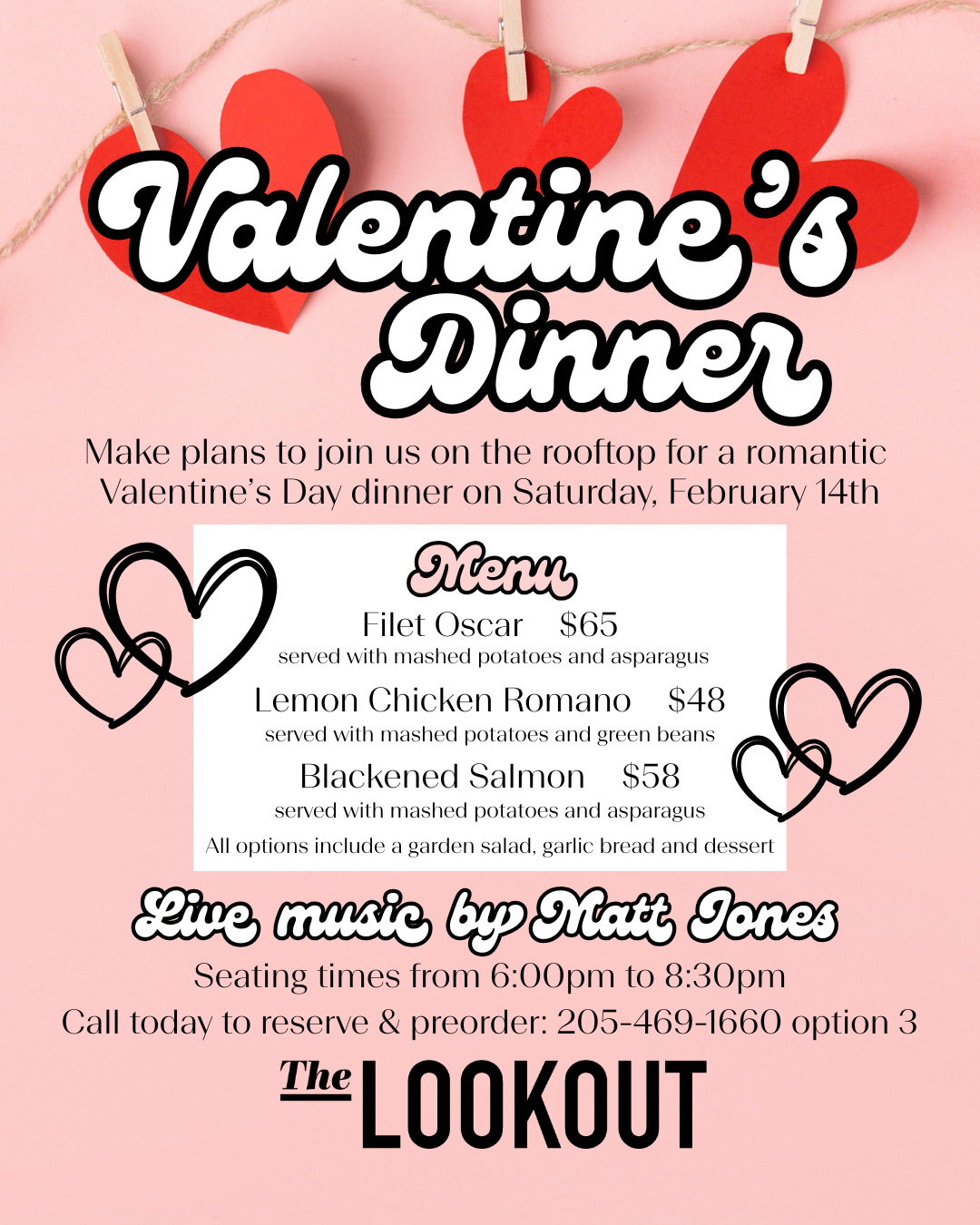 Treat your Valentine to a delicious meal featuring Filet Oscar, Lemon Chicken Romano, and Blackened Salmon. Call 205-535-3981 to book your table today! We will take your order when you make your reservation so everything is taken care of by the time you arrive for dinner.