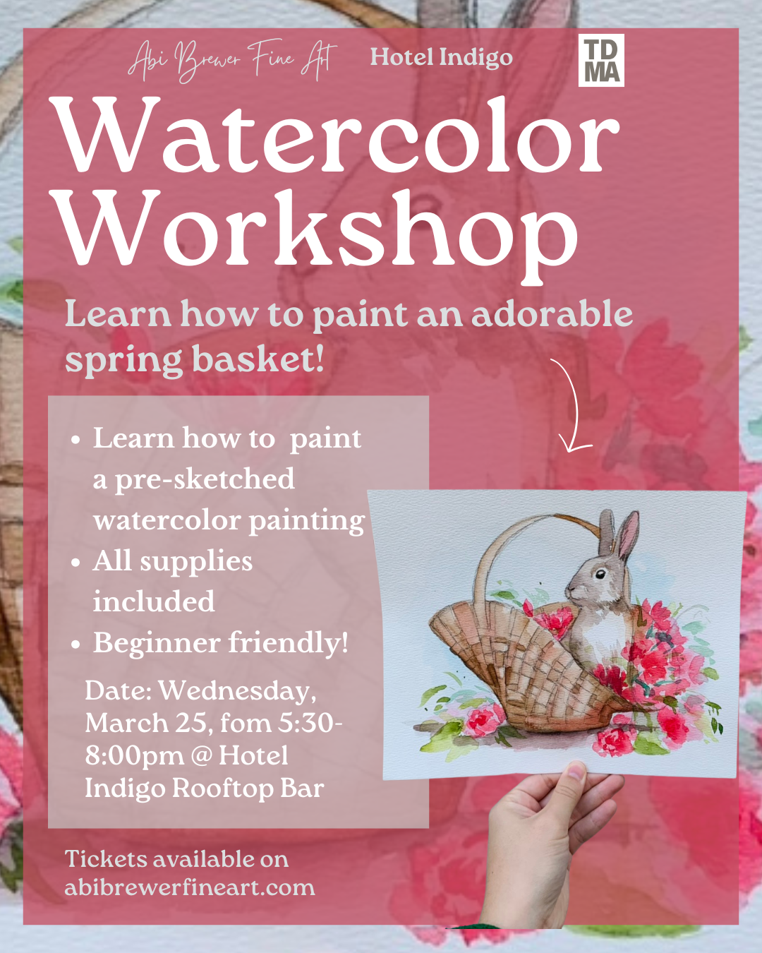 Learn how to paint an adorable spring basket! Pictures will come pre-sketched and all supplies you’ll need are included in the price. This workshop is beginner friendly and only costs $25.00 to attend. Workshop will take place from 5:30pm to 8pm at the Lookout Rooftop Bar, on top of Hotel Indigo Tuscaloosa. The Lookout will be serving drinks and food to enjoy while you paint.